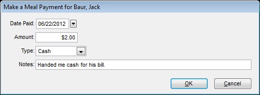 You may also manually charge a meal item to a students’ account by clicking on the Charge button. The Worker button will assign a Free Meal to a student that helps out as a worker. It will show in the students’ meal balance as a worker meal.
