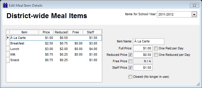 Meal Items Setup – Meal Items must be setup each year. If a Meal Item changes price mid-year then a new Meal Item must be created and used from that point on. To setup Meal Items: Go to the File Menu – District Setup – Meal Items Setup to Launch the Meal Items Form. From here you can add edit all of the items offered at the cafeteria. Use the Primary navigation toolbar new icon (or right click menu) to add new items. Once all of your items have been added, close the form and your ready to print the scan reports.